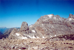 Il canale da noi seguito non ? l'unica alternativa. L'opposto versante ? infatti occupato da dossi detritici e lingue di neve che possono essere percorsi senza troppi problemi e che consentono di incrociare il sentiero che porta, verso destra, alla conca occupata da Le Grand Lac. |